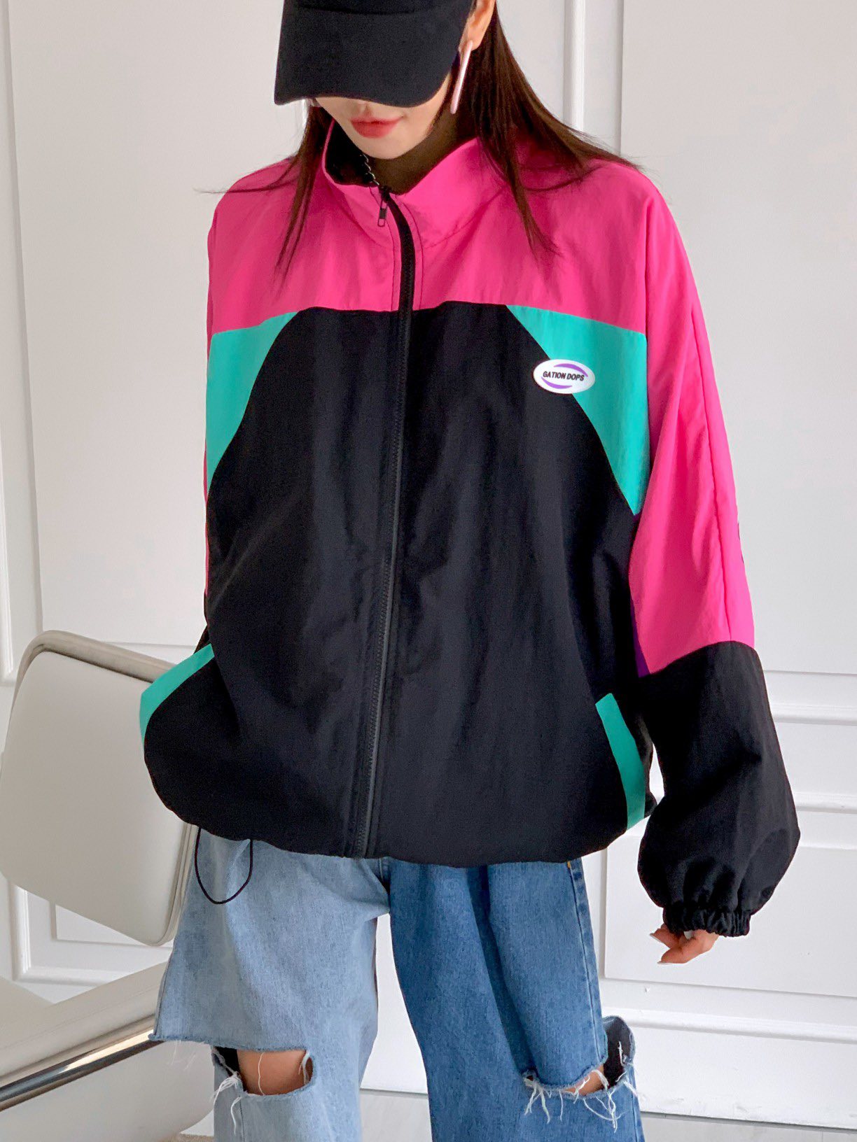 韓國袖拼接牛仔粗針織車標外